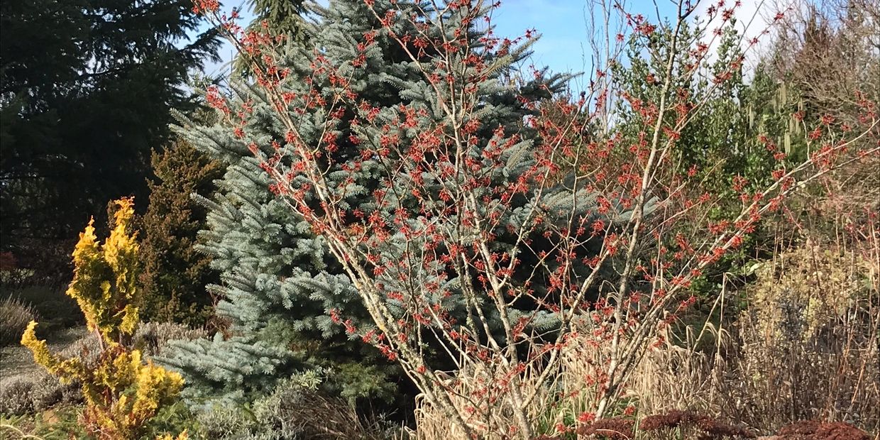 On Sunday, February 9, 2020, The Surya Chandra Center and Healing Gardens hosted the Hardy Plant Society of Oregon (HPSO)'s first Open Garden Tour of 2020. It was a beautiful sunny February day, with a blue sky that illuminated the Surya Chandra Garden's collection 25 different varieties of witch hazels (Hamamelis).